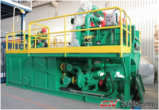 2. 兩臺GNZS703E-HB振動篩作為整個固控系統的一級固液分離設備被安裝在一具泥漿罐上。該型號的振動篩匹配三片篩網和緩沖錄井罐。兩臺振動篩下面的泥漿罐的罐底是傾斜式,便于進行排砂作業。