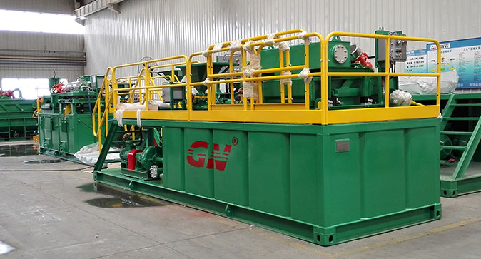 本套系統(tǒng)分為2個(gè)階段的固控處理和一套泥漿配置混合系統(tǒng)。鉆井泥漿初步分離采用的是冠能GNZS752型振動(dòng)篩,200GPM的處理能力、兩片篩網(wǎng)的構(gòu)造用來處理鉆井泥漿中的大顆粒的固體。振動(dòng)篩處理后的液體通過離心泵輸送給迷你型的沉降離心機(jī)GNLW223進(jìn)一步處理,可達(dá)3800RPM的轉(zhuǎn)速,分離的固體顆粒可達(dá)到2個(gè)微米。