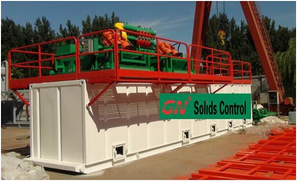 冠能150GPM泥漿系統配置如下 1、1臺GNZS703D雙層振動篩上安裝了3個4寸除泥旋流器,通過GNZS703D雙層篩可以把粗砂除去,然后通過除泥旋流器把20um左右以上的顆粒在分離除去, 2、2臺GNSB4X3-12J的砂泵安裝在泥漿罐斜倉上,1臺用于給除泥器供漿,另外1臺作為混漿泵使用。 3、4米長的泥漿罐,非常緊湊的設計跟合理的布局,對于狹小的鉆井空間非常適宜。